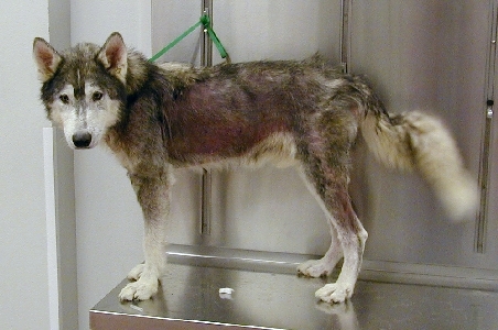 Milo came to Texas Alaskan Malamute Rescue in horrible condition. He had hardly enough hair to call his own, what hair he had was coarse and broken. His skin was greasy, thickened, crusty, inflamed and scratched raw. Rather than the originally suspected mange, Milo was diagnosed with a severe skin yeast infection called Malazessia Dermatitis. He was malnourished and heartworm positive. Milo also has a thyroid imbalance (hypothyroid), which initially hid his malnutrition and low weight.