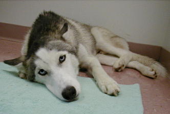 The vet knocked out Sam (one of our Mal rescues) for a direct blood transfusion with Aldine, who by was now going into shock from blood loss. But the transfusion couldn't be done after finding the pup's main internal bleeding was from his ruptured intestine. The transfusion would also have put Sam in danger since the pup's blood was now too contaminated to be mixed with Sam's to use. Our vet would need to find and close "bleeders" as quickly as possible and Aldine would have to make do with what blood he had left. Our vet really didn't think the pup would make it through the several hours of surgery. Fortunately Aldine surprised us all and survived!