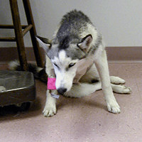 A month later and Aldine is still with us! Although we would love to have Aldine go into a real foster home, he will have to wait a bit longer. Just as he was to be transferred to Husky Haven, a rescue emergency came up and Husky rescue is trying to save 24 dogs (including small puppies!) seized from an Austin backyard breeder. As Aldine is safe and happy at the vet clinic, we decided it would not be fair to those needy dogs to transfer Aldine yet. In the meantime, he loves his snuggles and adding his singing voice to the resident Malamutes during the evening howl.